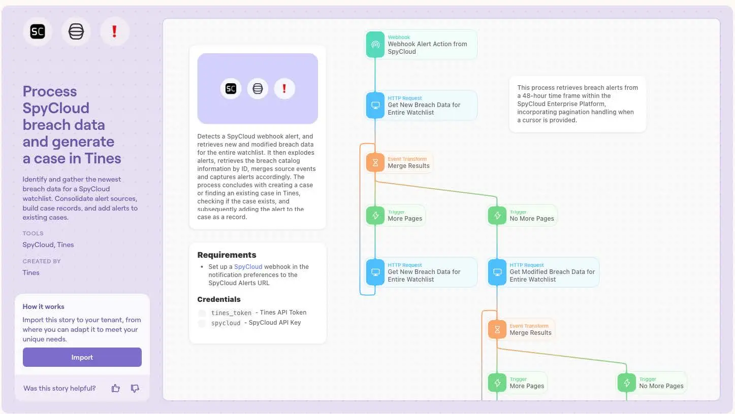 - To get started with a free trial and experience the power of automation with Tines, explore SpyCloud's published Stories or start creating your own response.