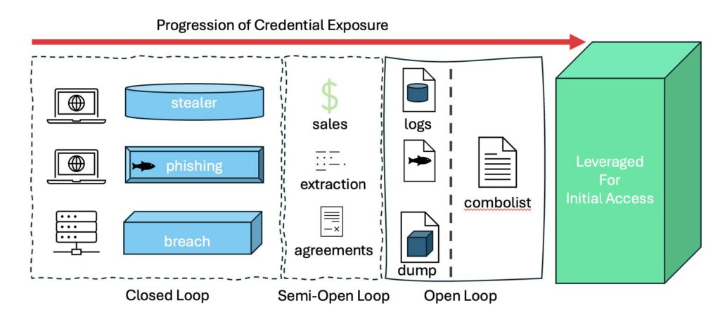 Credential exposure starts with a compromise, whether it be from stealer malware, phishing campaigns, or breaches. At this point, only the attackers and the victims can know about the compromise (Closed Loop in Figure 3). The circle of access expands when this data is sold or traded in the marketplace, or shared in agreements between threat actors. In some cases, the data can be extracted from records of attacker infrastructure. At this point, however, the data isn’t widely available (Semi-Open Loop in Figure 3).