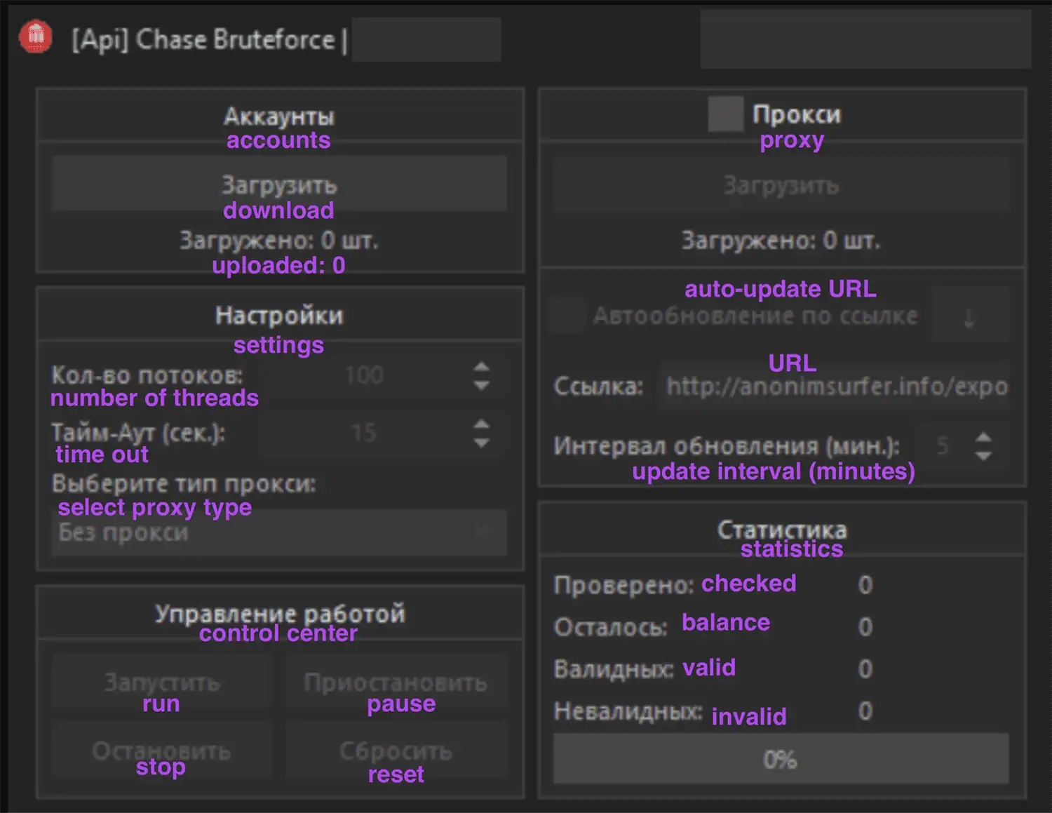 Figure 15: Translation of a Russian brute forcing tool built to target Chase customers. We have added English translations of the tool’s features in purple.