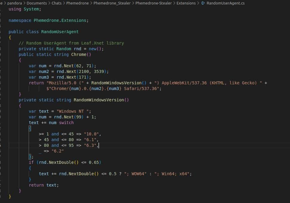As observed in the screenshot below, Phemedrone has the ability to generate random useragents, which it uses during communication with its C2. This possibly helps it sneak by detections that might rely on hardcoded useragent values.