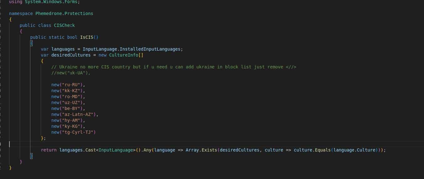 Phemedrone has a check that checks if a victim is a speaker of the following languages spoken in Commonwealth of Independent States (CIS) countries, by using a keyboard language check, as observed in Image 4: