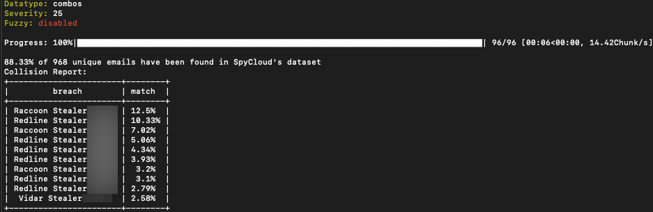 The validity of combolists can be determined by the source they came from. SpyCloud researchers hypothesized that a significant contributor to validity would be stealer logs, acquired from malware running on infected devices. Malware can be very stealthy and generate stealer logs, which include critical data for executing cybercrime, such as the login credentials, device and cookies, auto-fill data, extensive information about the device/OS and so much more that is exfiltrated directly from the infected machine. Therefore, combolists are evidently valid if they are made from these stealer logs, which can be seen in their quantifiable collision rate, or match rate (which shows a percentage of (exact) matching data from one set to another log) to the various types of stealer logs.