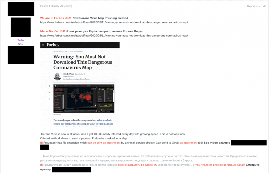 Figure 4: Screenshot of an advertisement for “Corona Virus Map Phishing Method” on a popular criminal forum.