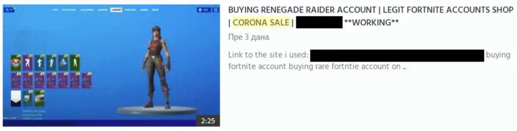 Figure 10: Screenshot showing an advertisement for Fortnite accounts with “CORONA SALE” in the description.