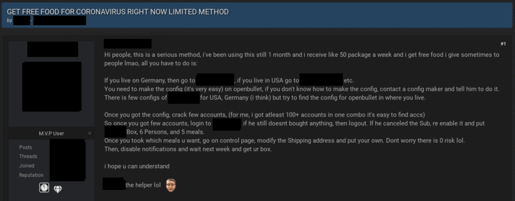 SpyCloud researchers recently observed a threat actor sharing instructions for cracking and taking over meal-kit delivery accounts on a popular criminal forum. Food delivery providers with online or mobile ordering applications can expect to see an uptick in credential stuffing attempts as attackers try to get free groceries delivered to avoid going outside during the pandemic.