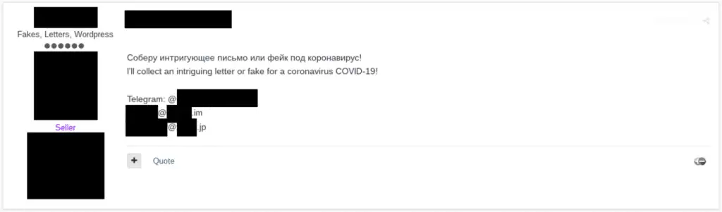 The scam letters are priced from $20 to $100. Scam WordPress sites cost $300 to $500. This particular actor’s work looks fairly professional and seems to be somewhat popular. Based on the “Scams” listing, SpyCloud researchers speculate that the actor has the ability to spin up scam shops for items related to coronavirus prevention, such as masks, but we have not seen proof of that.