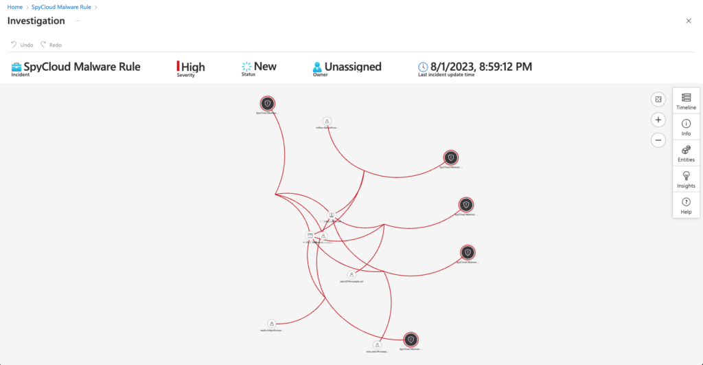 With SpyCloud Enterprise Protection for Microsoft Sentinel, breach and malware data from SpyCloud is ingested into Sentinel to create incidents and automate remediation. Security teams can take advantage of built-in incident response playbooks, or create their own automated steps for responding to breached credentials and malware exposures – calling SpyCloud’s API directly to gather enriched data for specific incidents.