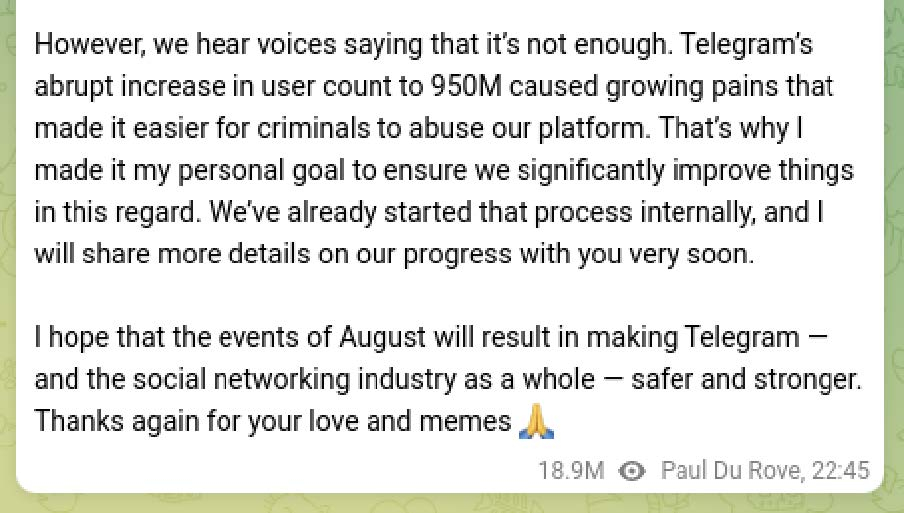 In late August, Pavel Durov, the CEO of Telegram, was arrested in Paris for allegedly allowing criminal activity on his platform and not complying with data requests from French law enforcement. In September, Durov announced new measures to increase content moderation of illegal activity on the Telegram platform, ostensibly to appease French authorities.
