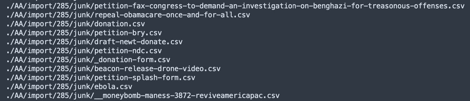 This mailing lists data consists of over 7,900 differently formatted files, making it much more challenging to parse than the other databases. Some of the files have particularly detailed filenames referring to things such as signatories to political petitions, political candidate supporters, election phone bank volunteers, and political donors for different causes.