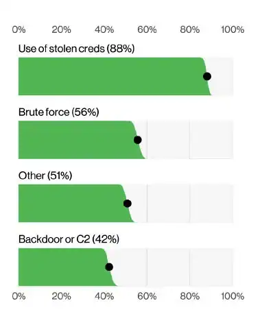 Credential-based attacks continue to dominate the threat landscape. Verizon reported that stolen credentials were still the most common initial access vector — used in 22% of breaches. Also notable: 88% of basic web application attacks involved the use of stolen credentials, making it the dominant tactic in this pattern.