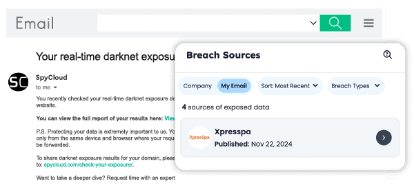 SpyCloud turns the tables by making darknet data work for businesses around the world. We detect when employee and customer credentials, cookies, PII and other critical stolen assets are in the hands of cybercriminals and automate remediation to reduce your risk of cyberattacks – including account takeover, ransomware, and online fraud.