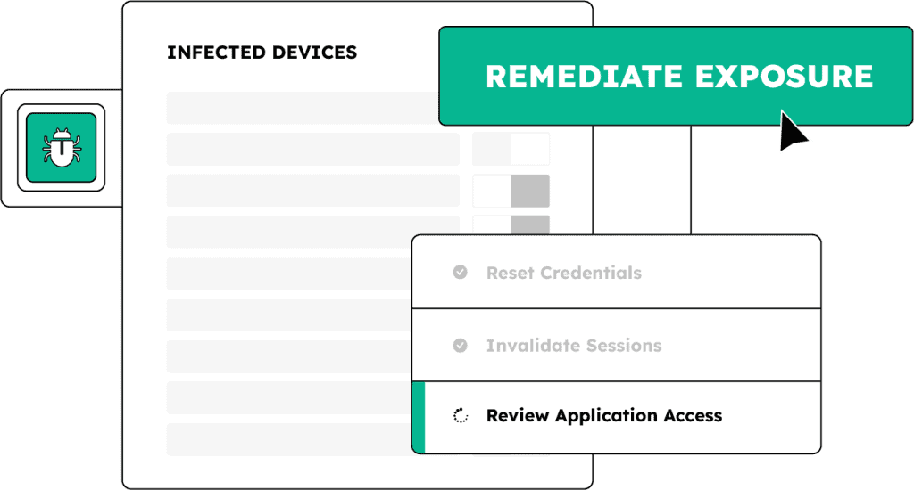 Reimaging an infected device isn’t enough. Infostealer malware captures credentials and session cookies, giving attackers access to your systems. SpyCloud shows you exactly what was stolen from infected devices and enables automated remediation steps to revoke access, reset application credentials, and invalidate session cookies to eliminate post-infection risk.